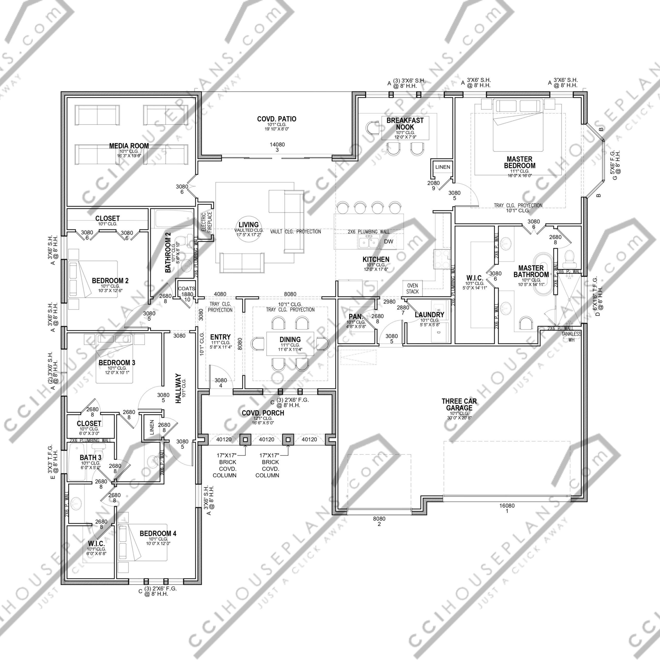 Additional Spaces: Includes a media room, laundry room, and pantry for added functionality.
