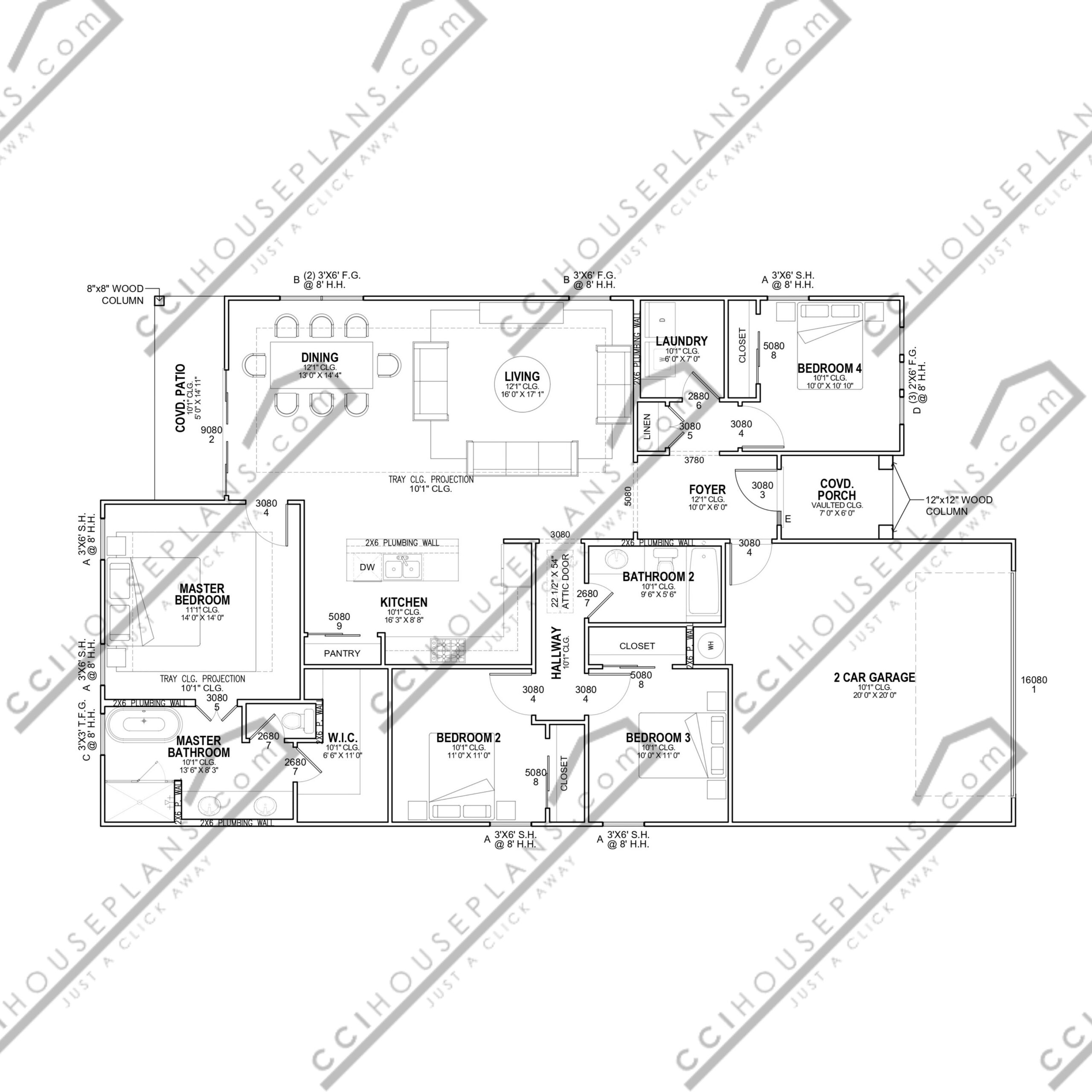 Drawing will indicate overall configuration of home at each side view and make note of plate heights, roof overhangs, window header heights, roof pitches, materials used and extent to which they are used and enlargement of any details we feel necessary to explain the construction.