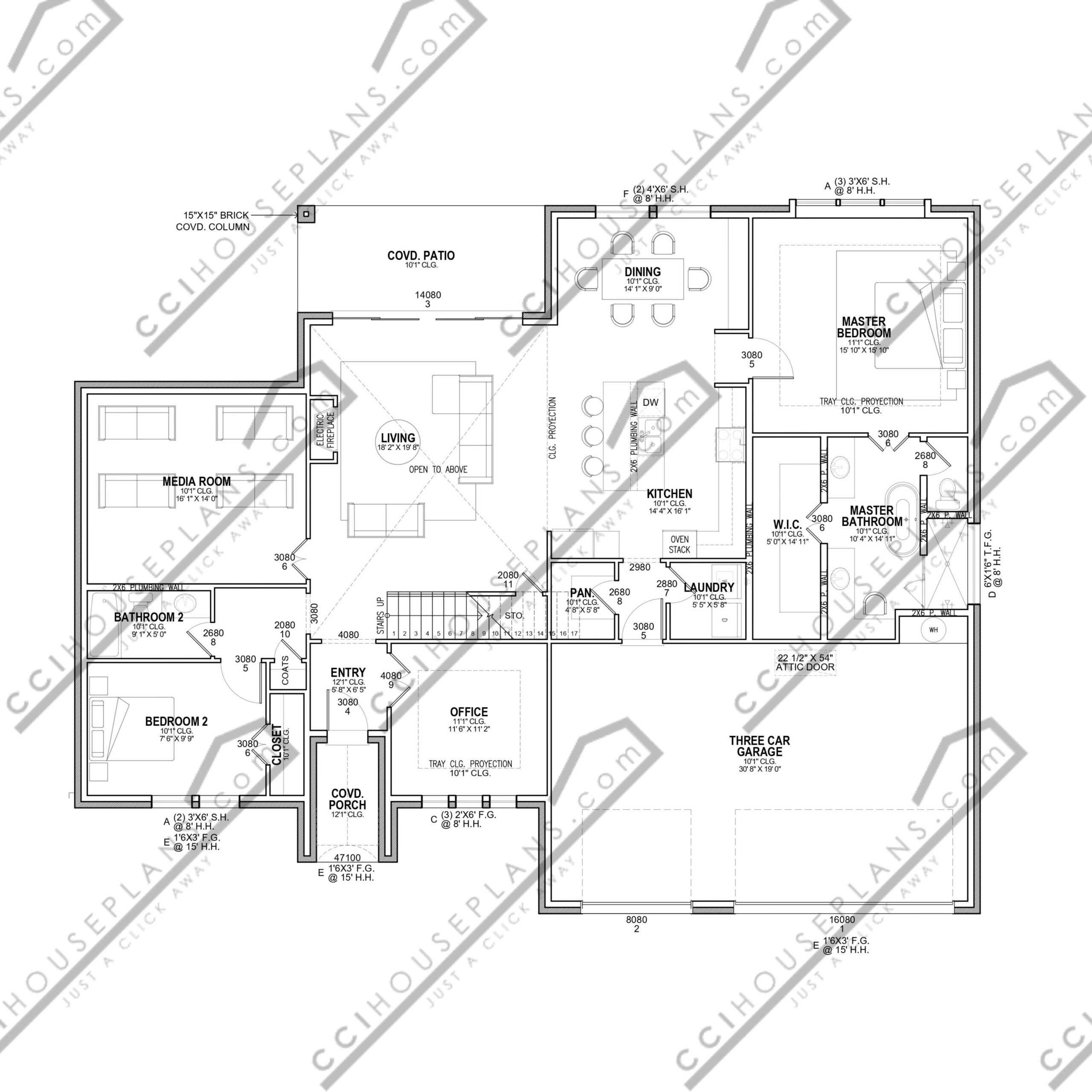 First-Floor Amenities: Includes one secondary bedroom, media room, office, laundry room, pantry, and an expansive covered patio.