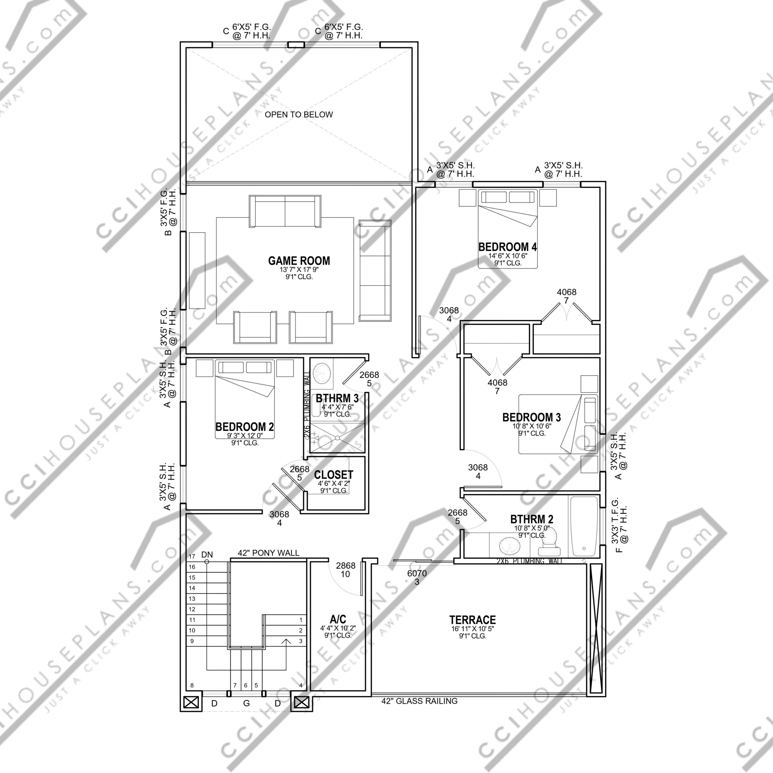 Game Room Overlook: A game room on the upper level overlooks the living area below, enhancing the sense of openness and connection throughout the home.