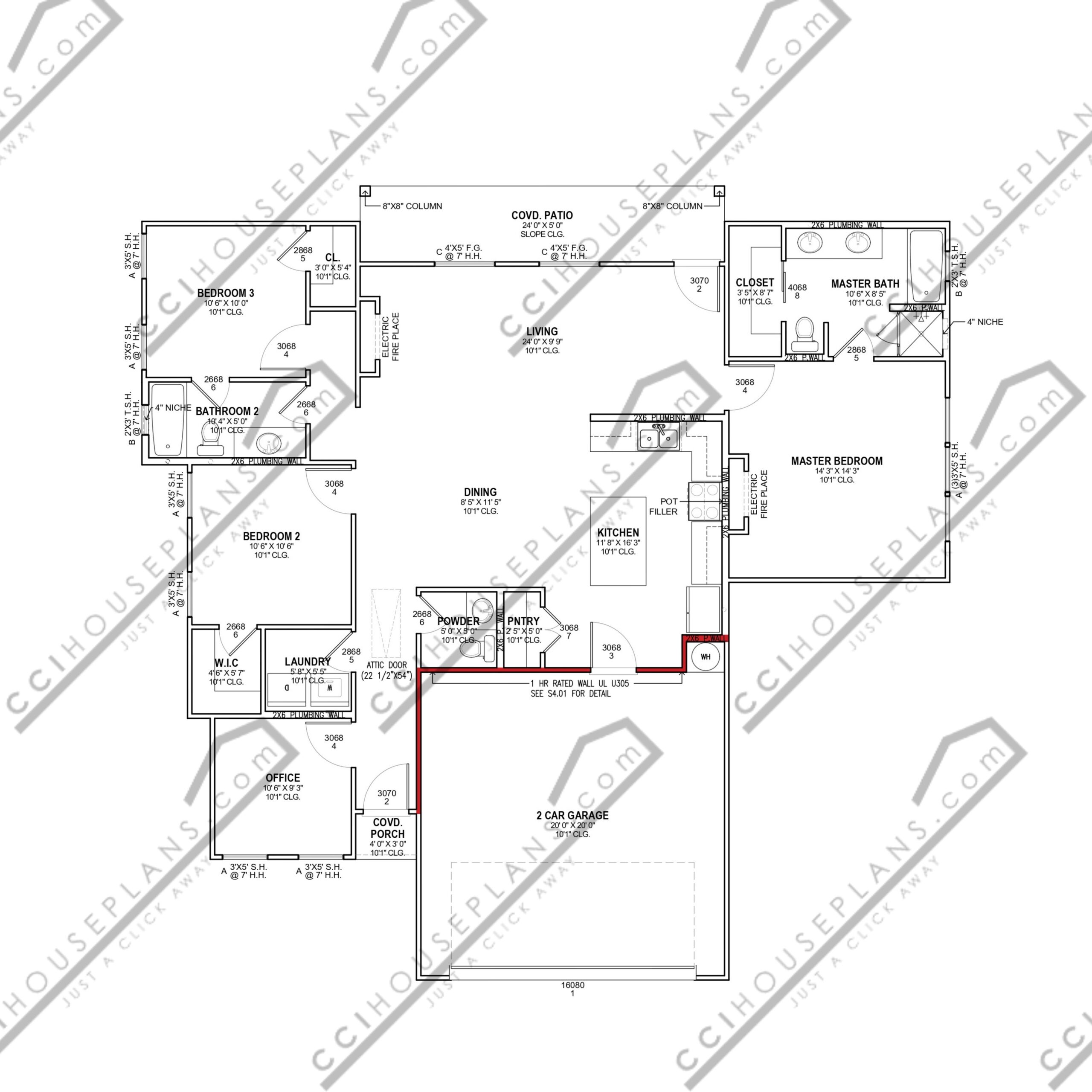 Scale floor plan indicating location of frame and masonry walls, support members, doors, windows, plumbing, fixtures, cabinets, shelving, ceiling conditions and notes deemed relevant to this plan.